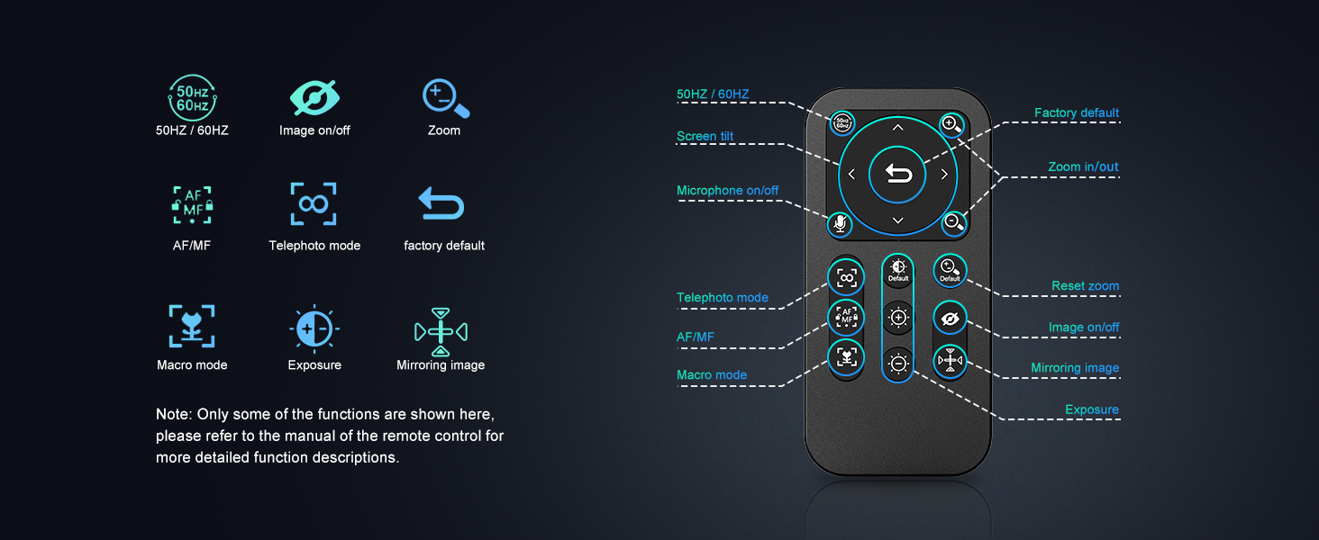 Remote Control 18-button 360° remote control (zoom in/out, brightness adjustment, one-touch mute, AI toggle, preset modes, etc.).